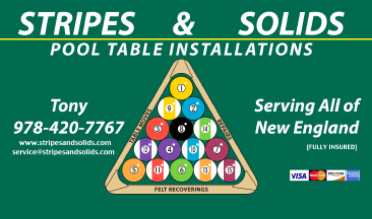Stripes and Solids has been serving the New England area for over 20 years. We are experience Brunswick, Olhausen, Connelly, Plank & Hide, Playcraft, Presidential Billiards and Spencer Marston.