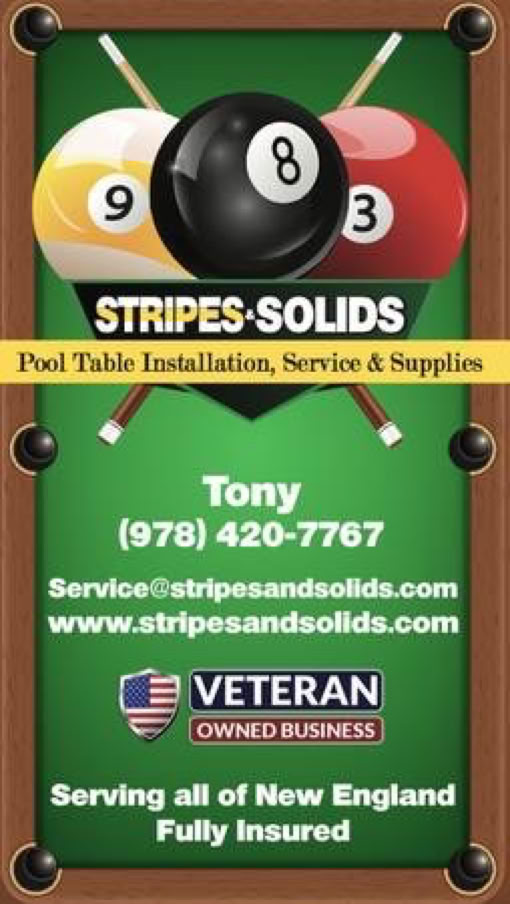 Stripes and Solids has been serving the New England area for over 20 years. We are experience Brunswick, Olhausen, Connelly, Plank & Hide, Playcraft, Presidential Billiards and Spencer Marston.